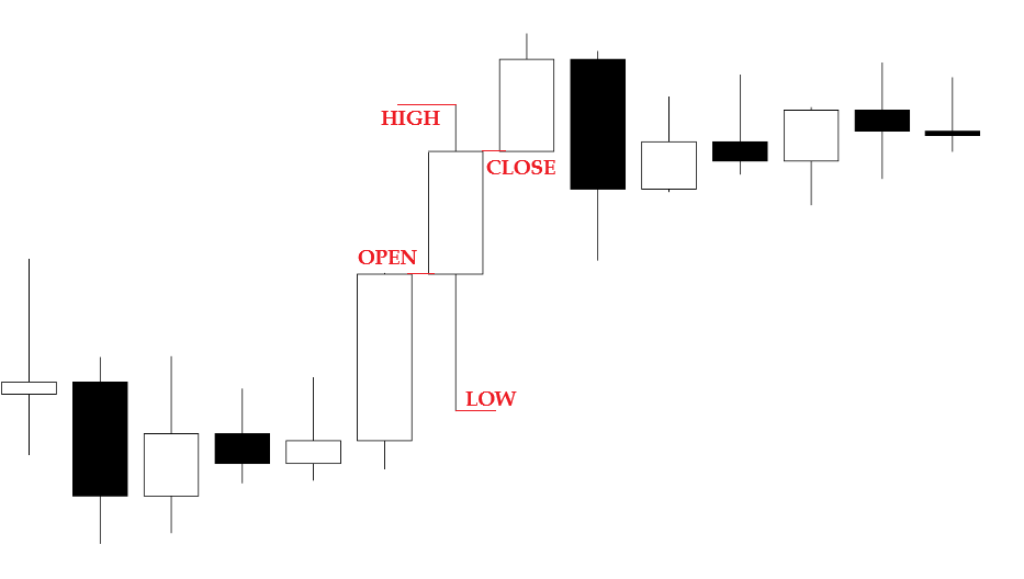 Las velas japonesas representan visualmente los movimientos de precios dentro de un periodo determinado, ya sea minutos, horas, días o semanas. Cada vela está compuesta por: