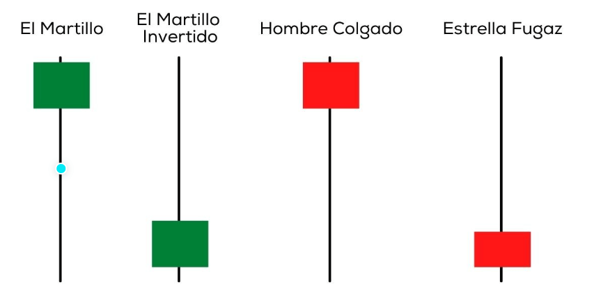 - Martillo: Indica una posible reversión alcista. Se forma cuando el precio de apertura y cierre están cerca de la parte superior de la vela, con una mecha larga inferior.
