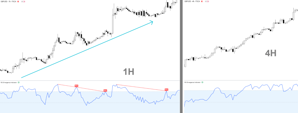 - Divergencias: Cuando el precio está haciendo nuevos máximos o mínimos, pero el RSI no lo está, esto puede indicar una posible reversión. Por ejemplo, una divergencia alcista puede señalar un cambio de tendencia hacia arriba.