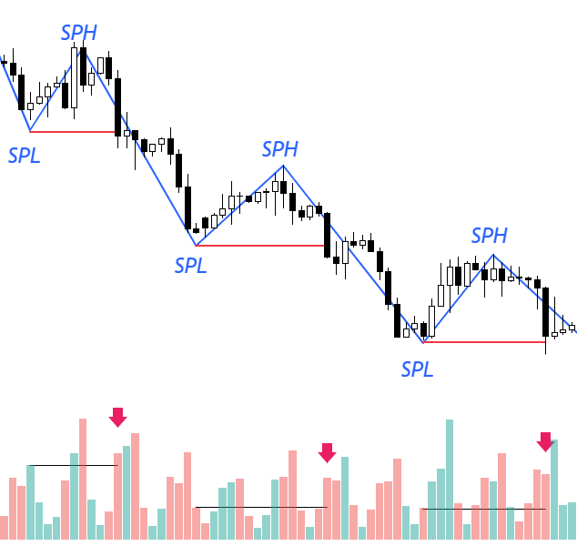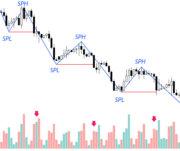 - Ejemplo práctico: Una tendencia bajista confirmada tiene un volumen más bajo al romper un swing point en comparación con una sospechosa.