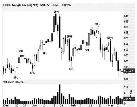- Si las próximas cinco barras no logran superar el máximo del posible SPH, el máximo de la sexta barra se convierte en el swing point alto actual.