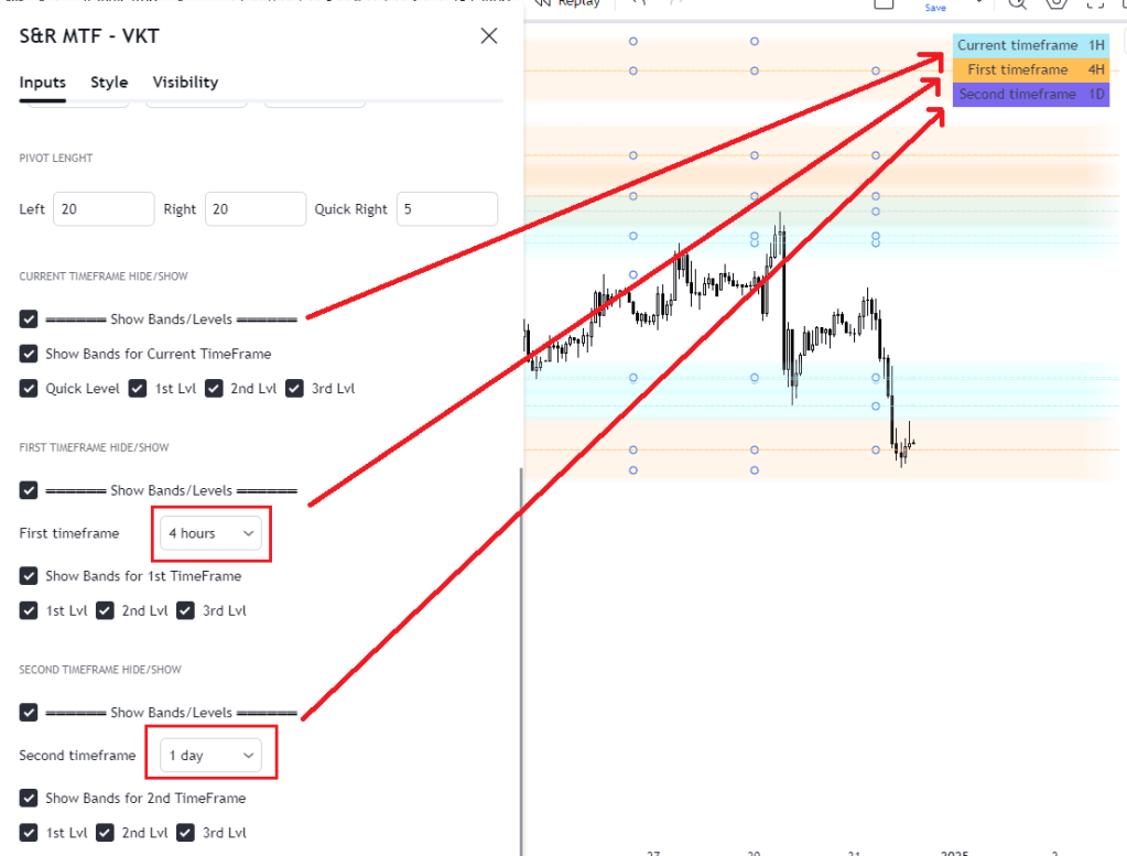 Tienes la opción de mostrar u ocultar los niveles y las bandas para el marco de tiempo actual, el primer y segundo marco de tiempo, lo que te permite personalizar la visibilidad de los niveles según lo que sea más relevante para tu análisis.