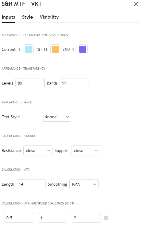El indicador utiliza el ATR para calcular el ancho de las bandas de soporte y resistencia, lo que da un toque dinámico a los niveles. Puedes ajustar el multiplicador de ATR para cada marco de tiempo, lo que te permitirá adaptar la sensibilidad de los niveles.