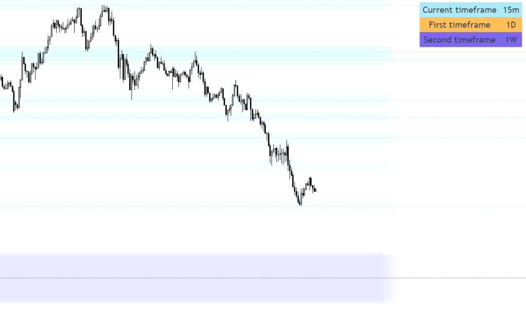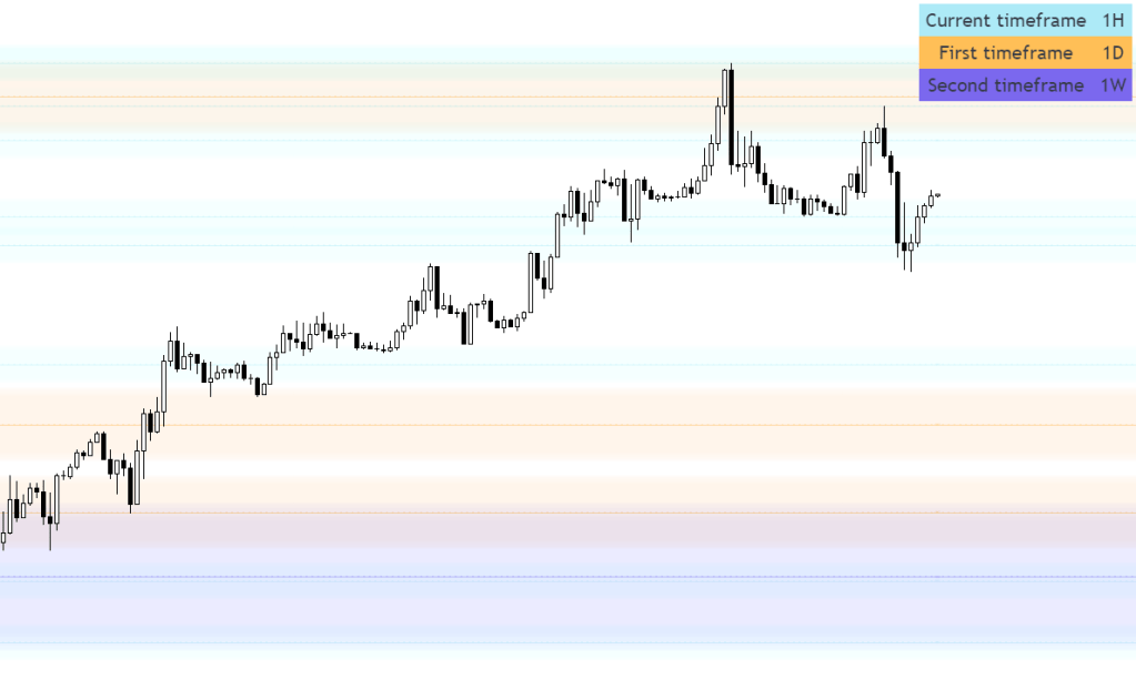 Imagina que estás operando en un gráfico de 1 hora y quieres ver los niveles clave también en un marco de tiempo diario y semanal. Con el indicador activado, verás las líneas de soporte y resistencia en estos tres marcos de tiempo de manera simultánea, lo que te permite tomar decisiones informadas sobre la dirección del mercado.