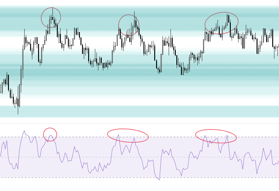 Ejemplo: Si el RSI está por debajo de 30 en el soporte, esto sugiere que el precio está sobrevendido y es un buen momento para comprar, mientras que un RSI por encima de 70 cerca de la resistencia indica sobrecompra, lo que puede ser una señal para vender o salir.