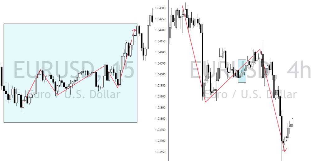 Una tendencia que parece estar en marcha en un marco temporal menor, como un gráfico de 15 minutos, puede no ser tan fuerte o persistente cuando la observamos en un gráfico diario. Esto ocurre porque las tendencias a corto plazo pueden estar influenciadas por ruido de mercado o movimientos aleatorios, mientras que en un marco temporal más amplio, las tendencias se consolidan y pueden tener un mayor potencial de continuidad.