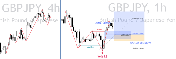 - El Smart Money, en cambio, identificaría esa liquidez y esperaría para identificar una ruptura correcta y un BOS o en su caso una una trampa de liquidez, para posteriormente entrar en una venta.
